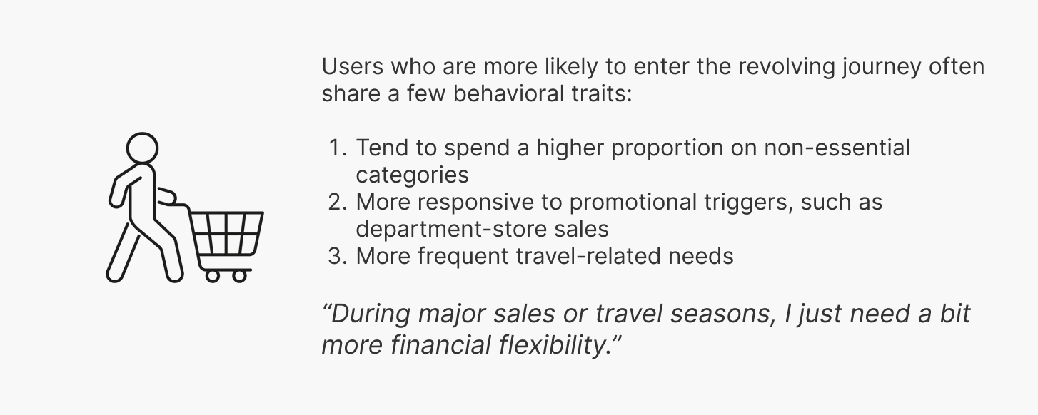 Users who had recently left the revolving cycle were 15× more likely to return compared to non-revolvers—a momentum also reflected in interviews: